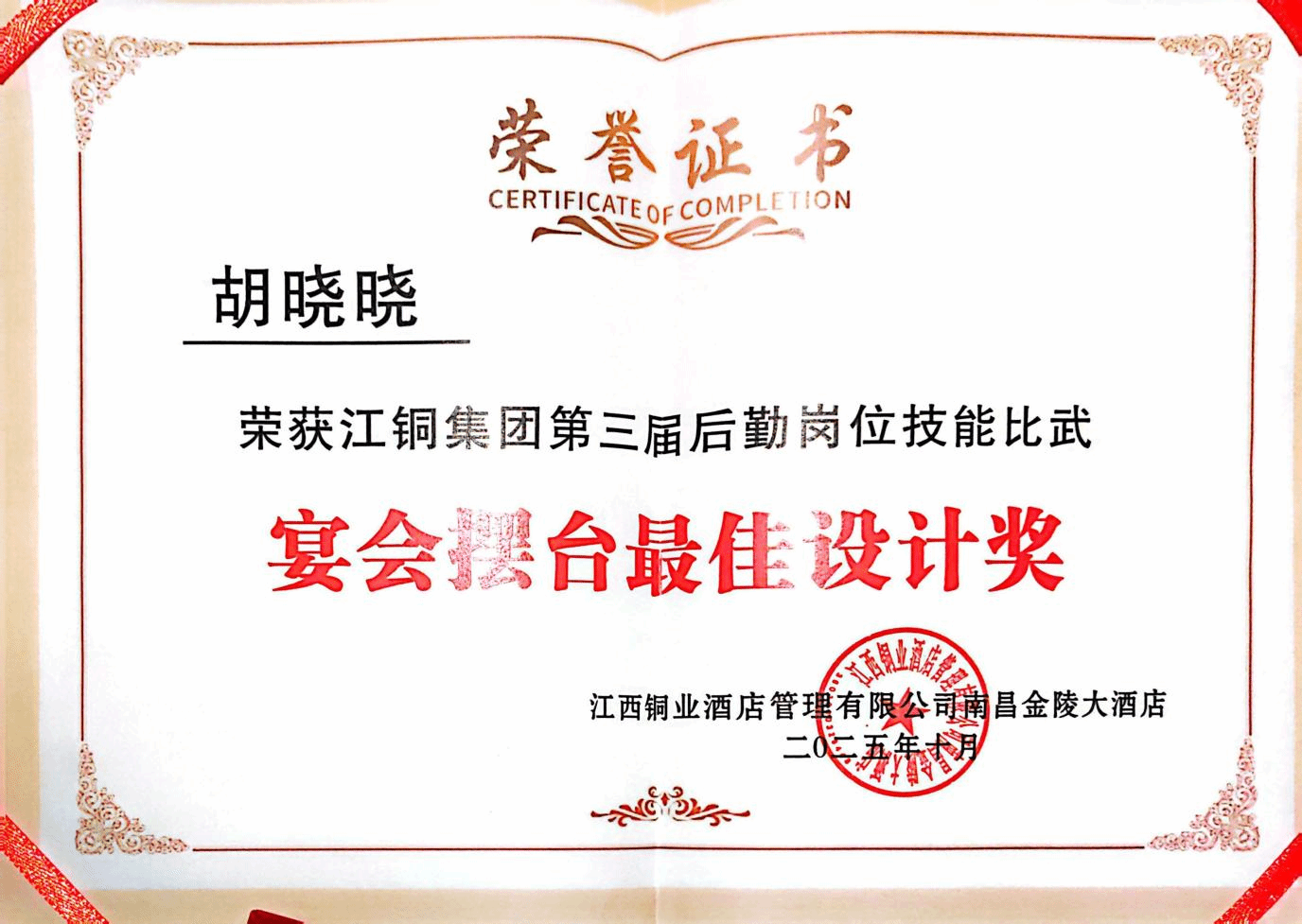 近日,由江西铜业股份有限公司工会委员会主办、江西江铜物业有限公司工会委员会承办的江铜集团第三届后勤岗位技能比武在南昌金陵大酒店举行。学校社会服务学院24级酒店与数字化运营专业学生胡晓晓在比赛中发挥出色,荣获“宴会摆台最佳设计奖”“宴会摆台最佳操作奖”两项殊荣,充分展现了我校学子精湛的专业技能与良好的职业风采。